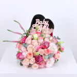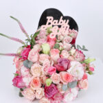 Acrylic newborn baby girl with roses and baby roses in light and dark pink and purple with the distinctive ostomy flower in addition to Eucalyptus with its fragrant scent in a beautiful and wonderful arrangement.