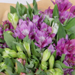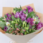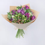 A special and unique bouquet of Alstroemeria flowers in white, purple and red, beautifully arranged with a beige cover, as a special gift for someone you love or who is dear to your heart.