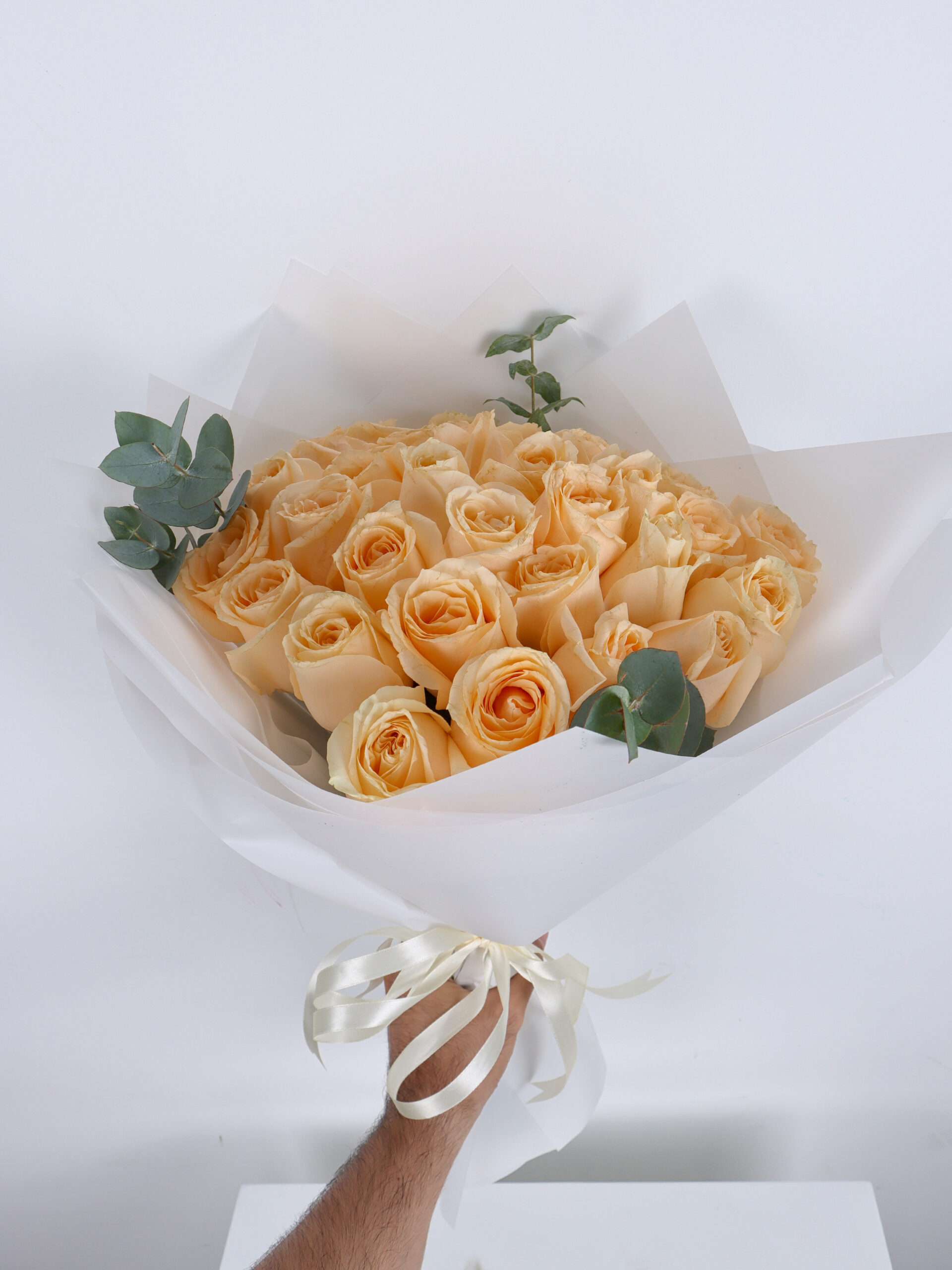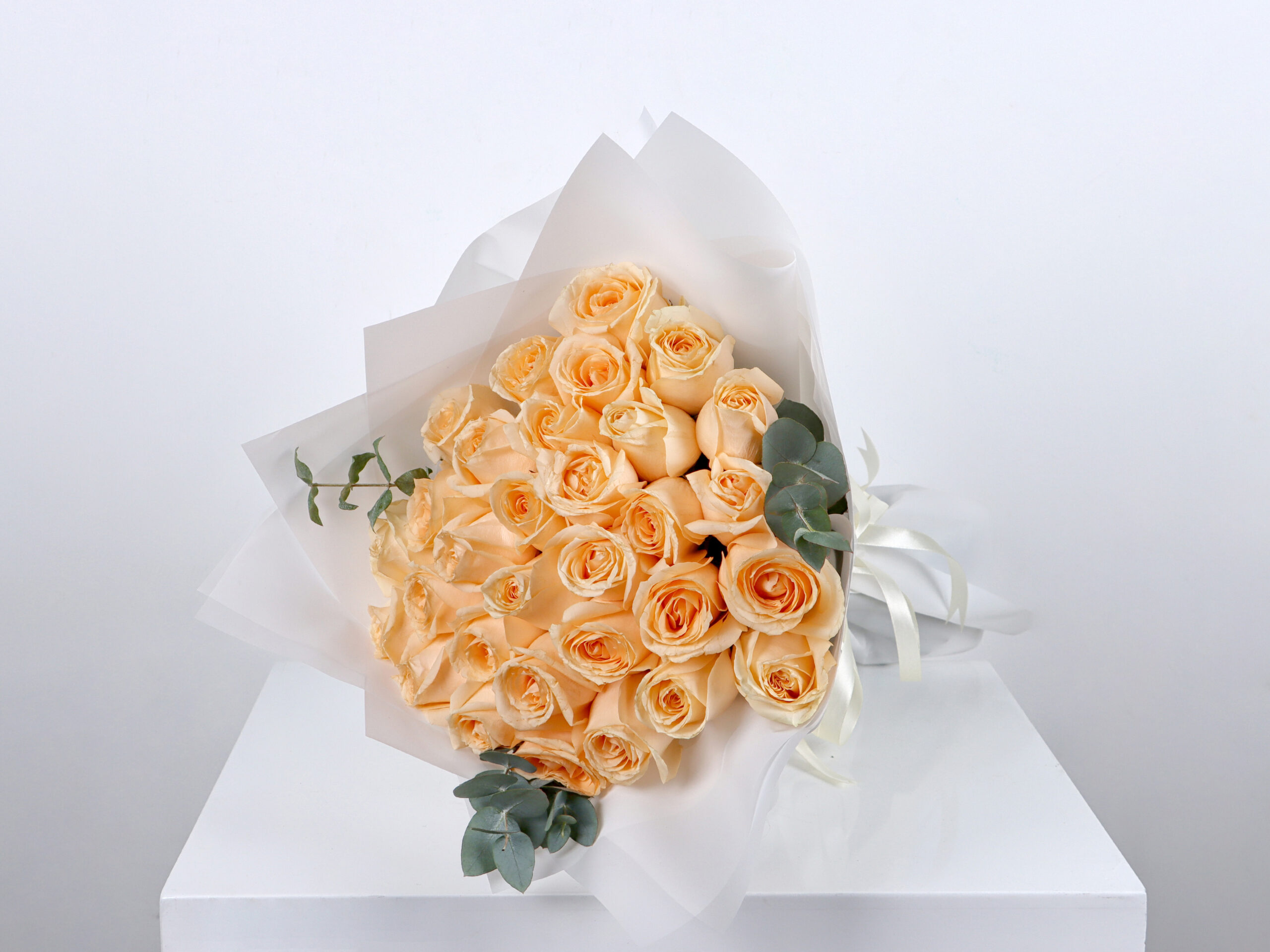 A white rose bouquet consisting of 30 beautifully arranged white roses with white and gray packaging