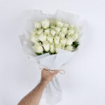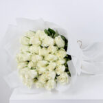 A white rose bouquet consisting of 30 lively white roses, arranged gradually from top to bottom in a beautiful way, with white packaging and a rope to tie.