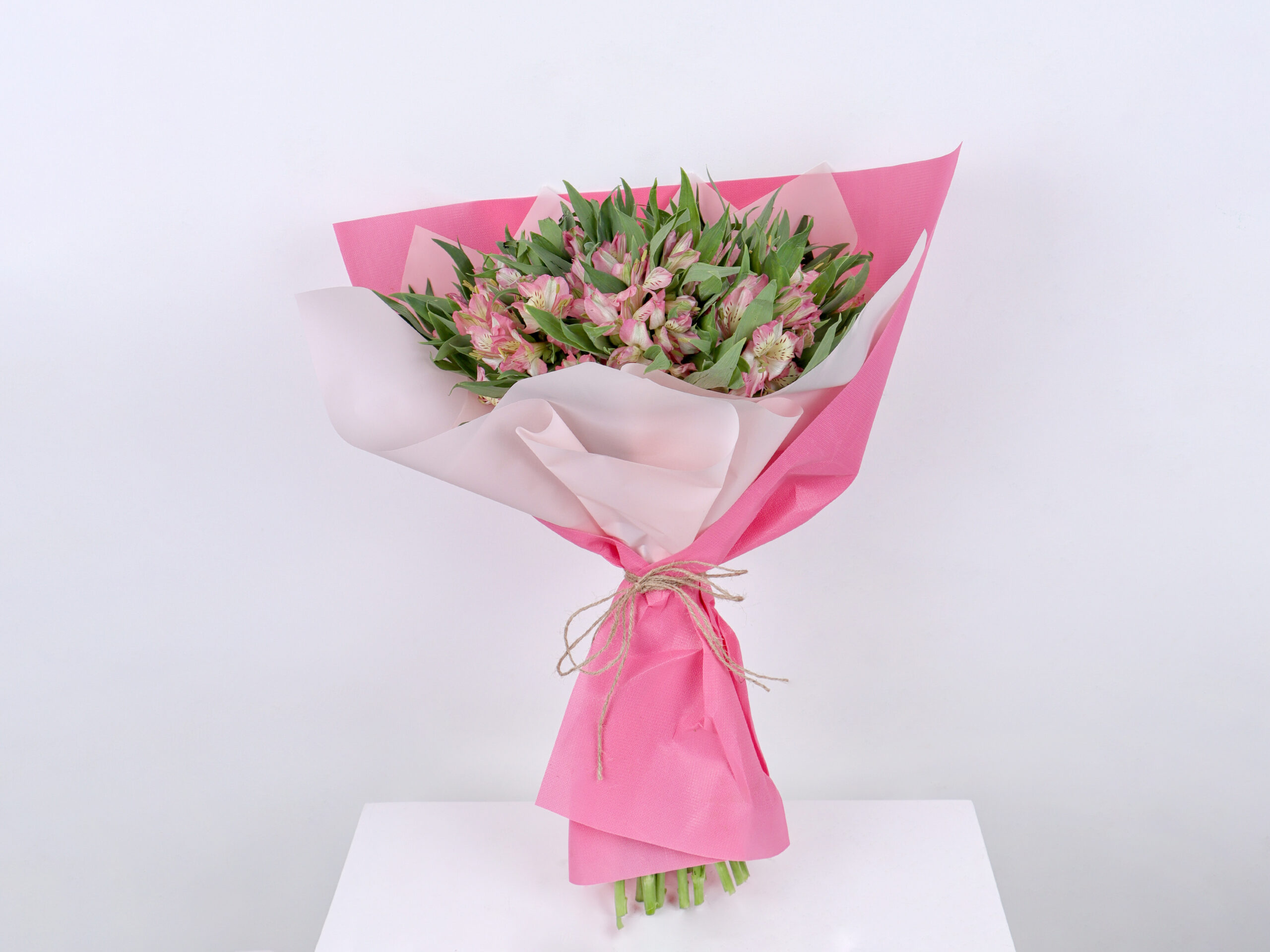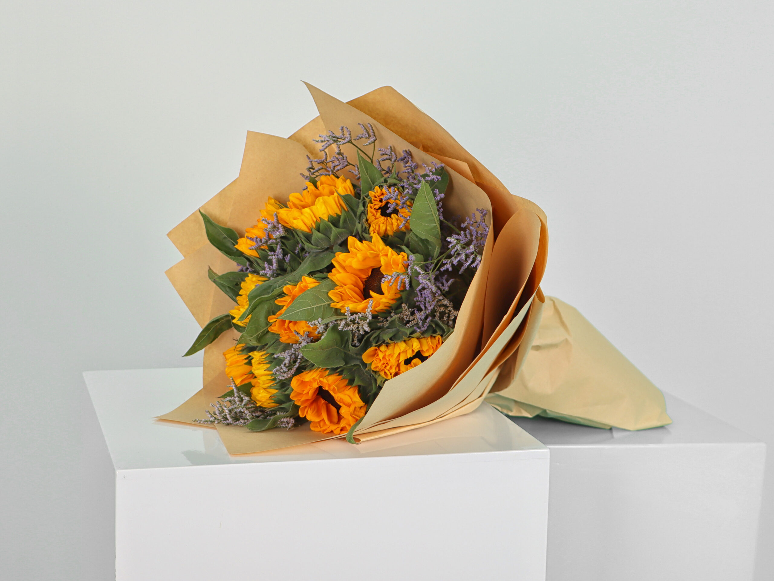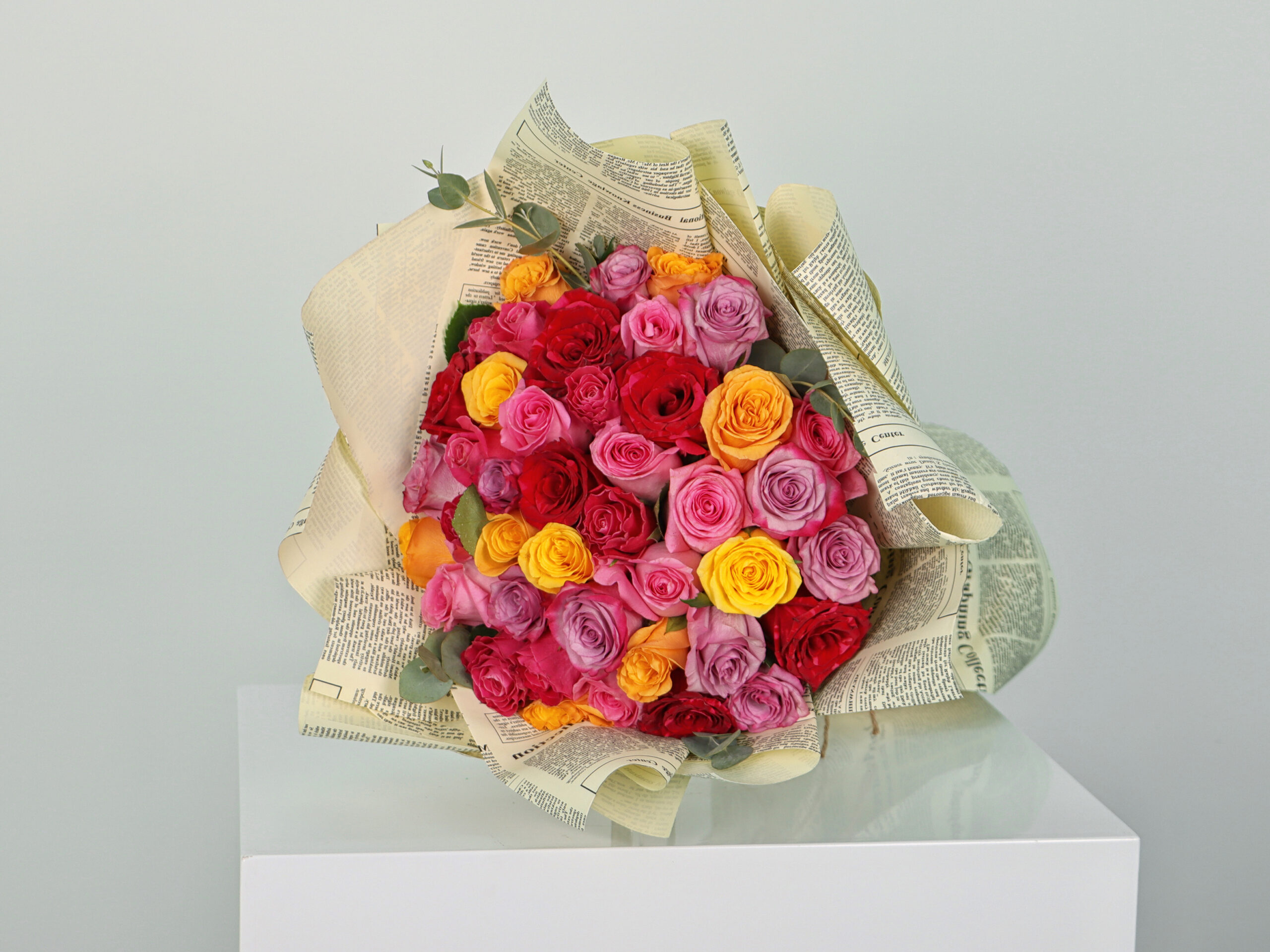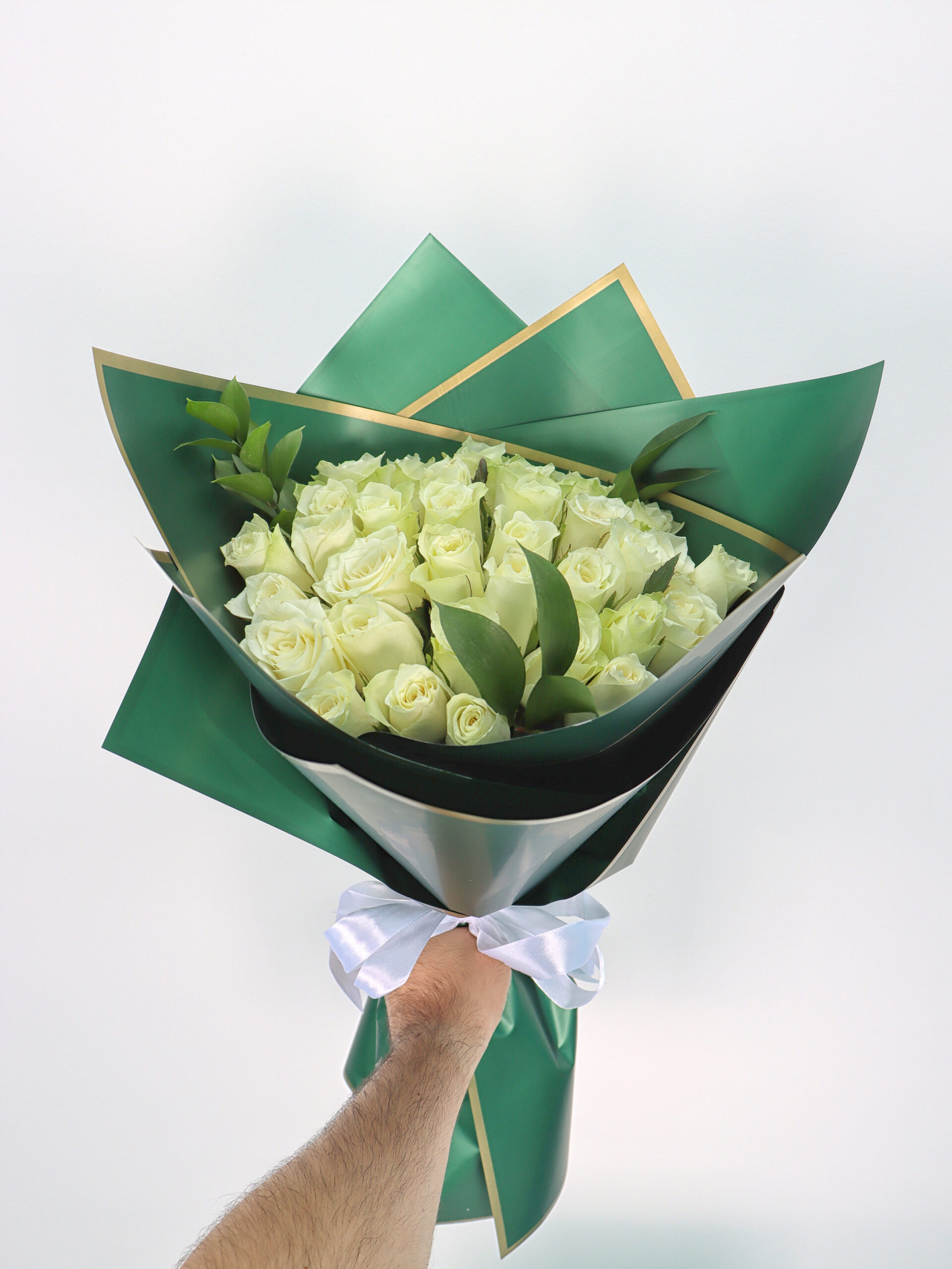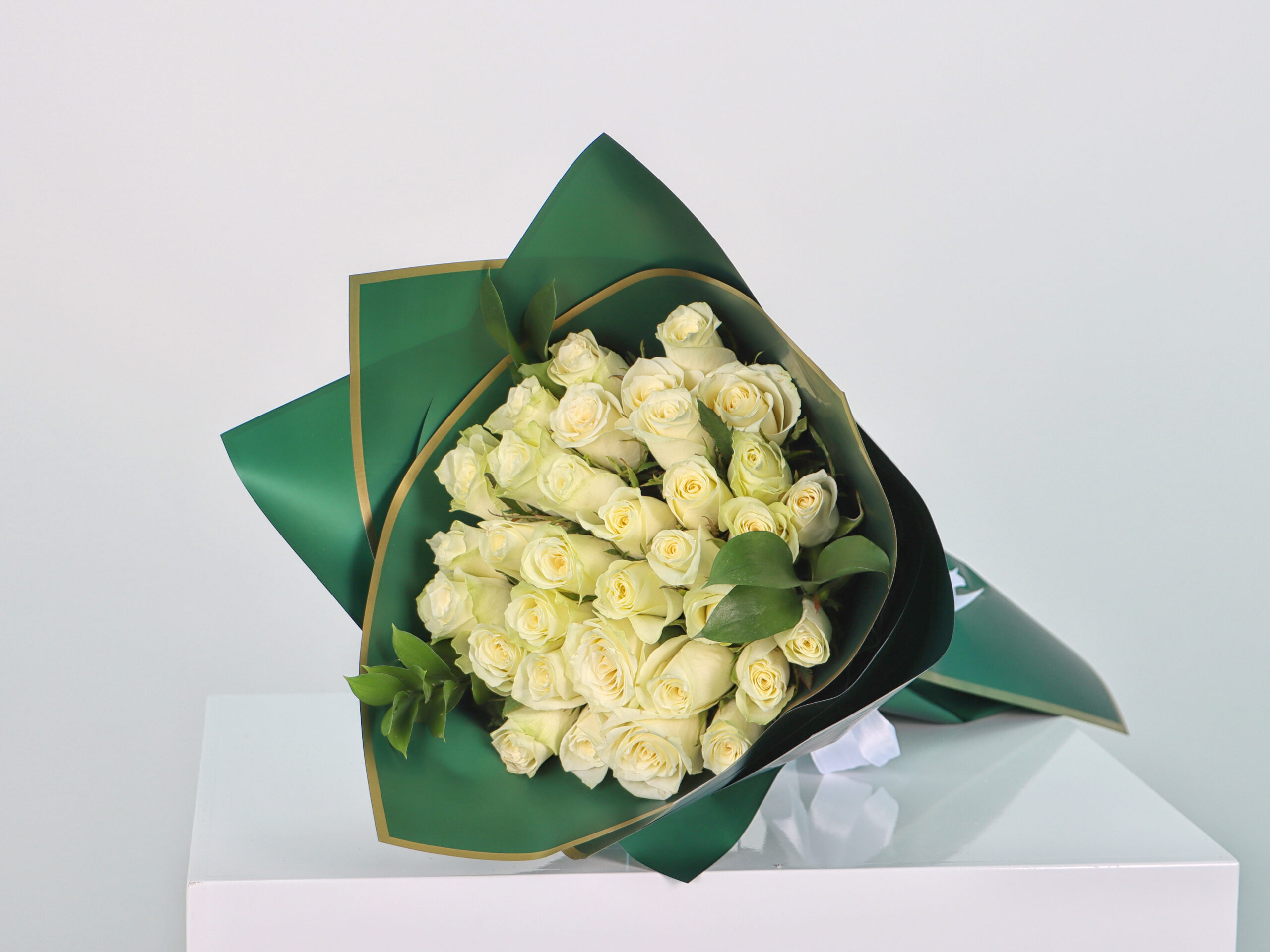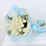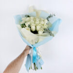 A beautifully arranged bouquet of white roses with Eucalyptus and beige and turquoise packaging