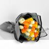 Mixed flowers of yellow, white and orange, beautifully arranged with a fragrant scent, with a black wrapper with Eucalyptus and a rope to tie.