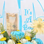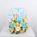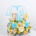 A baby boy gift with an envelope for money, roses and baby roses in blue, white and peach, with suedago and the distinctive gerbera flower, and the addition of an astoma and santini flower in yellow, in a beautiful and wonderful arrangement on acrylic. It contains a place to put the money as a special gift.