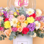 Soft baby girl box with roses and baby roses in peach, fuchsia, purple and yellow with the distinctive gerbera flower and the Matthiola flower that gives softness to the box with the vibrant yellow carnation flower with the addition of Eucalyptus with a fragrant scent in a beautiful and wonderful arrangement with a balloon printed with baby girl in the middle so that you have a complete box. Softness and bright colours