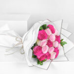 A beautiful pink and fuchsia bouquet consisting of 20 pink and fuchsia roses with a white wrapper and a rope to tie it.