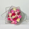 A beautiful spring bouquet consisting of fuchsia, white, pink and camellia roses, which give spring colors with a fragrant, lively scent, with solidago, with a silver wrapper in a beautiful arrangement and a rope to tie.