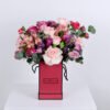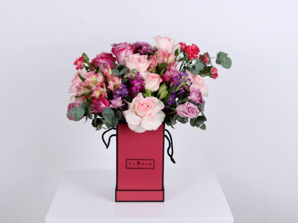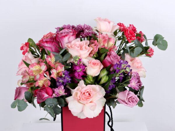 The pink box with a mix of roses in light pink, the camellia with the Matthiola flower in dark pink, the purple with the astoma and the chrysanthemum flower, in addition to the fragrant Eucalyptus, so that you have a pink box with a beautiful and wonderful arrangement as a gift for someone dear to your heart.