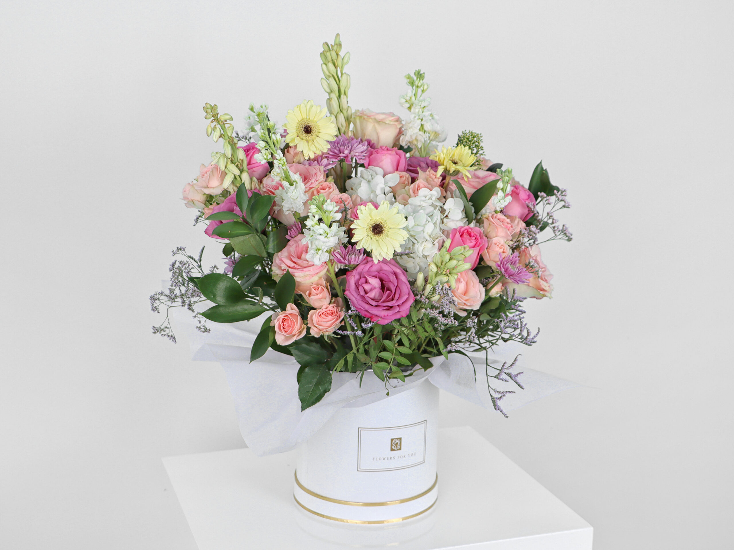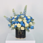 Blue winter box of roses in blue and white, like cold winter, next to each other, with the distinctive delphinium flower in blue with solidago, distributed among the roses in the box with the beautiful chrysanthemum flower in a beautiful and wonderful arrangement so that you have a box like the beautiful, refreshing cold as a gift for someone dear to your heart.