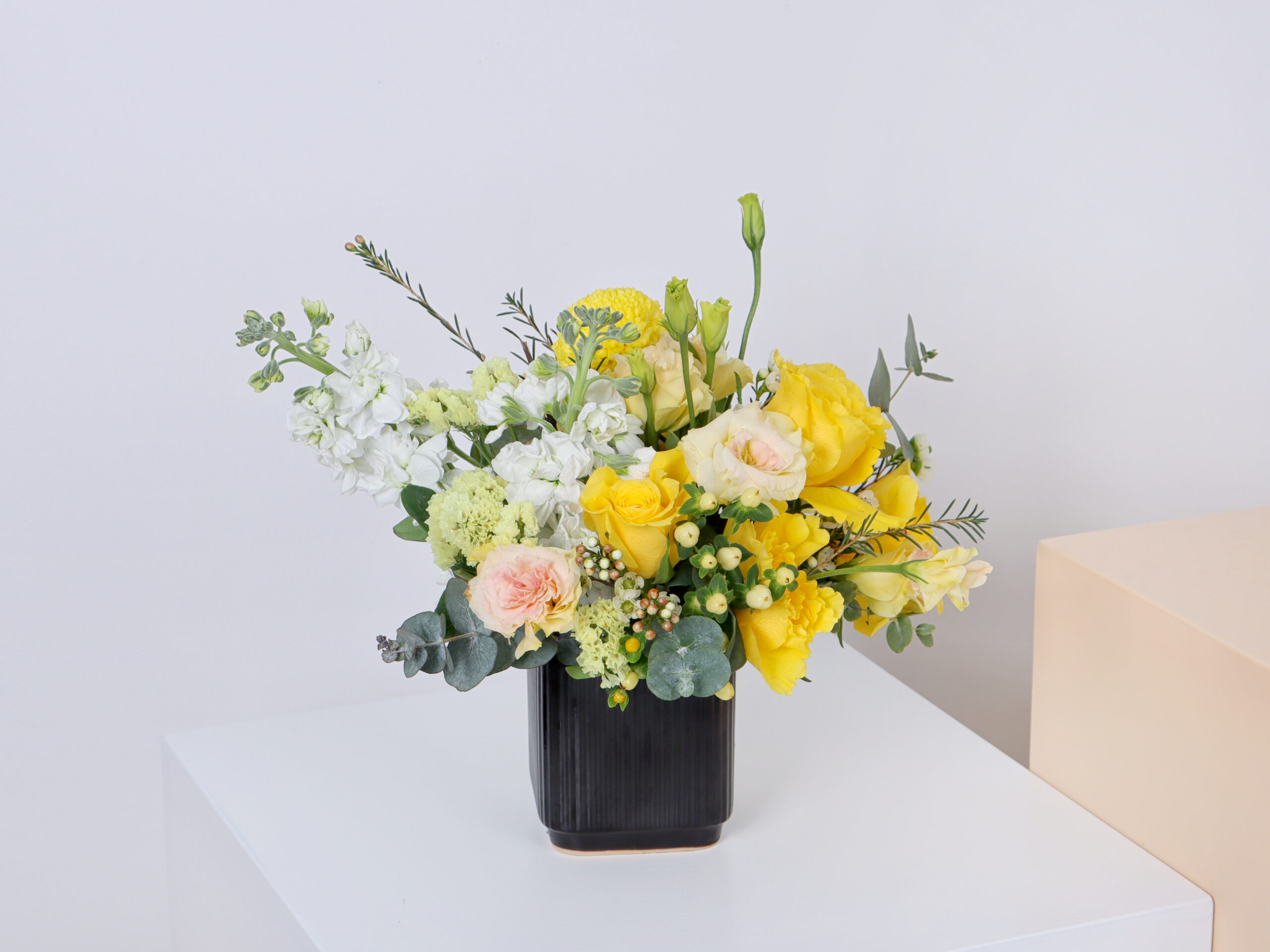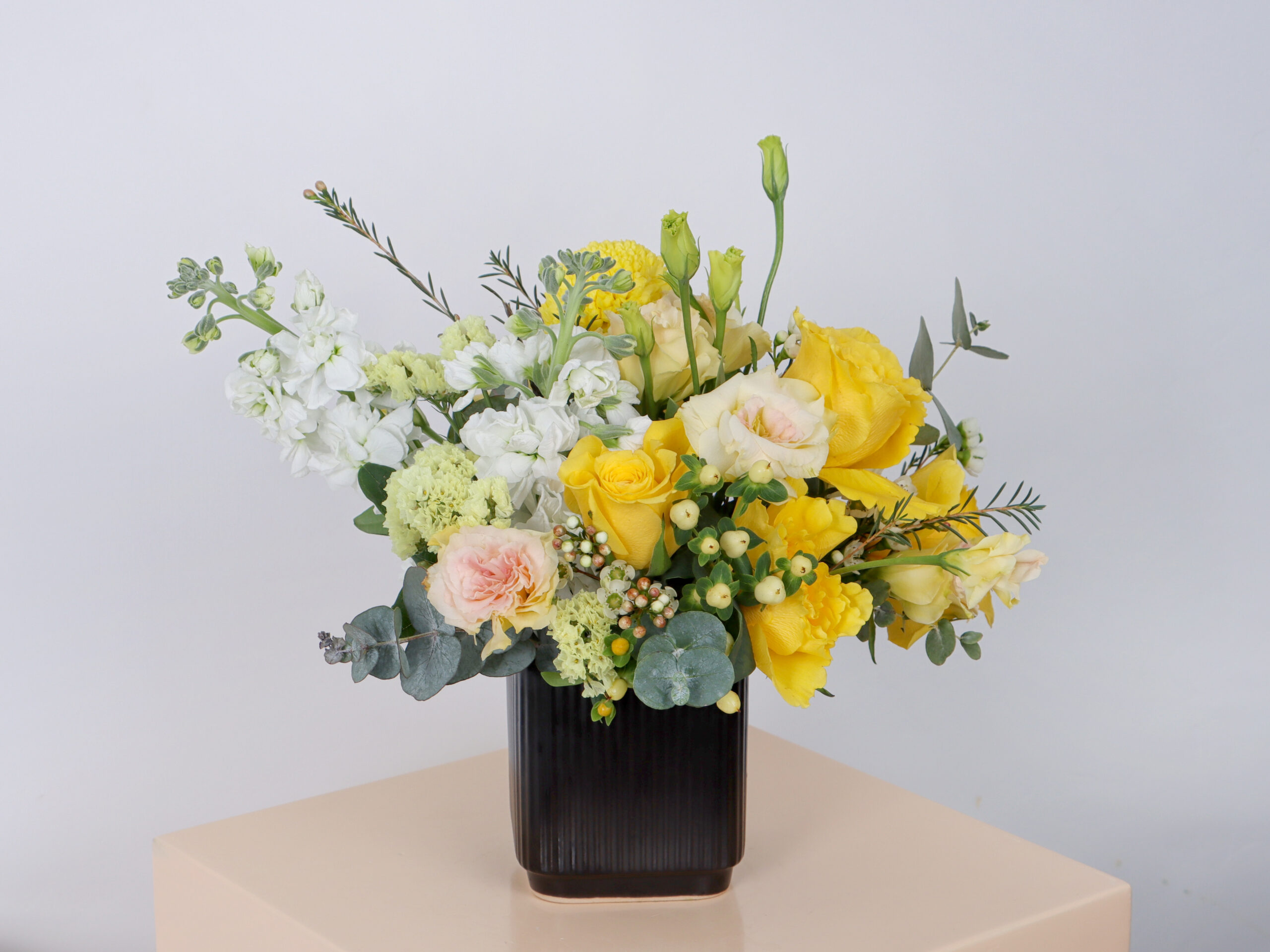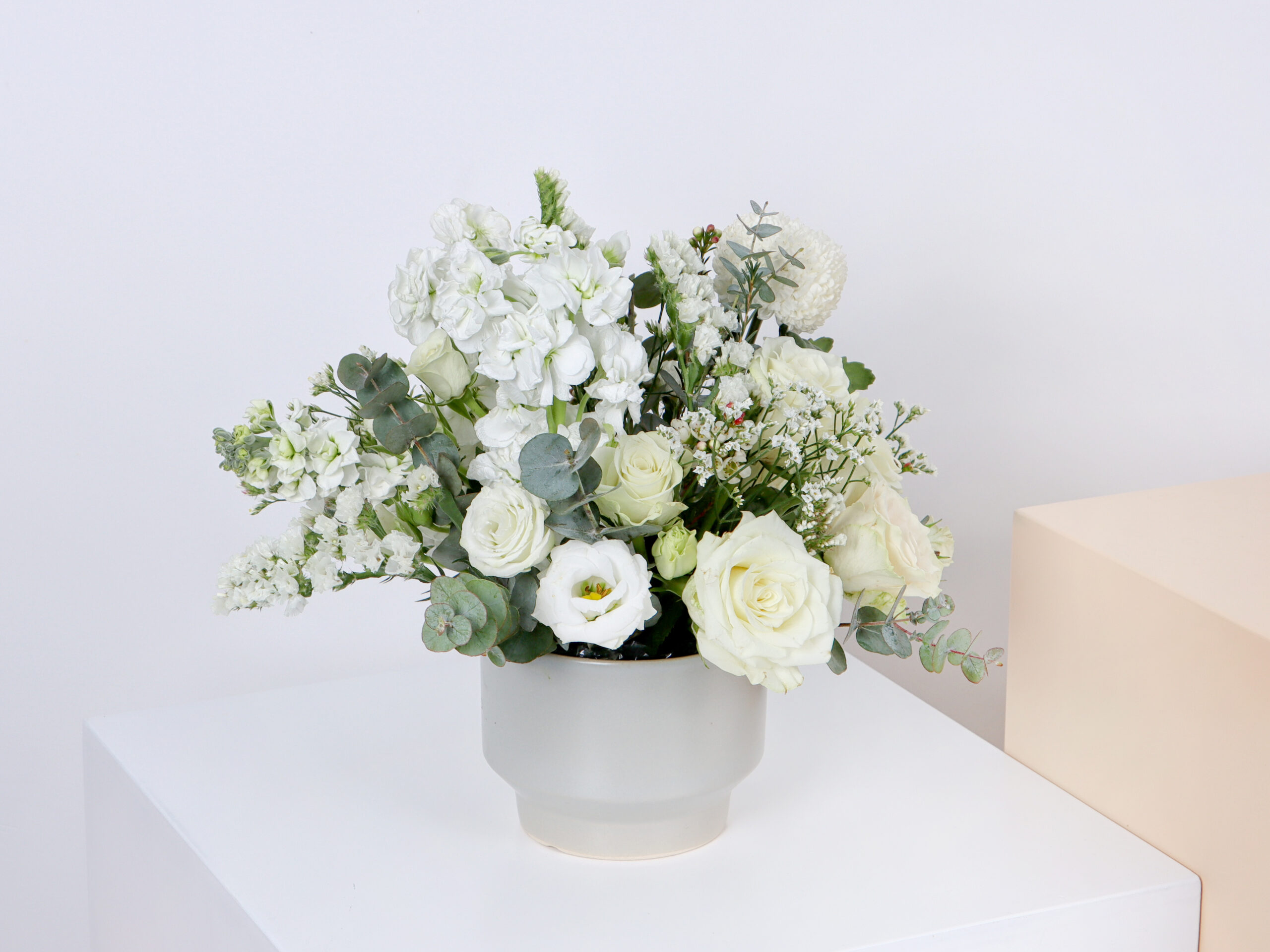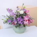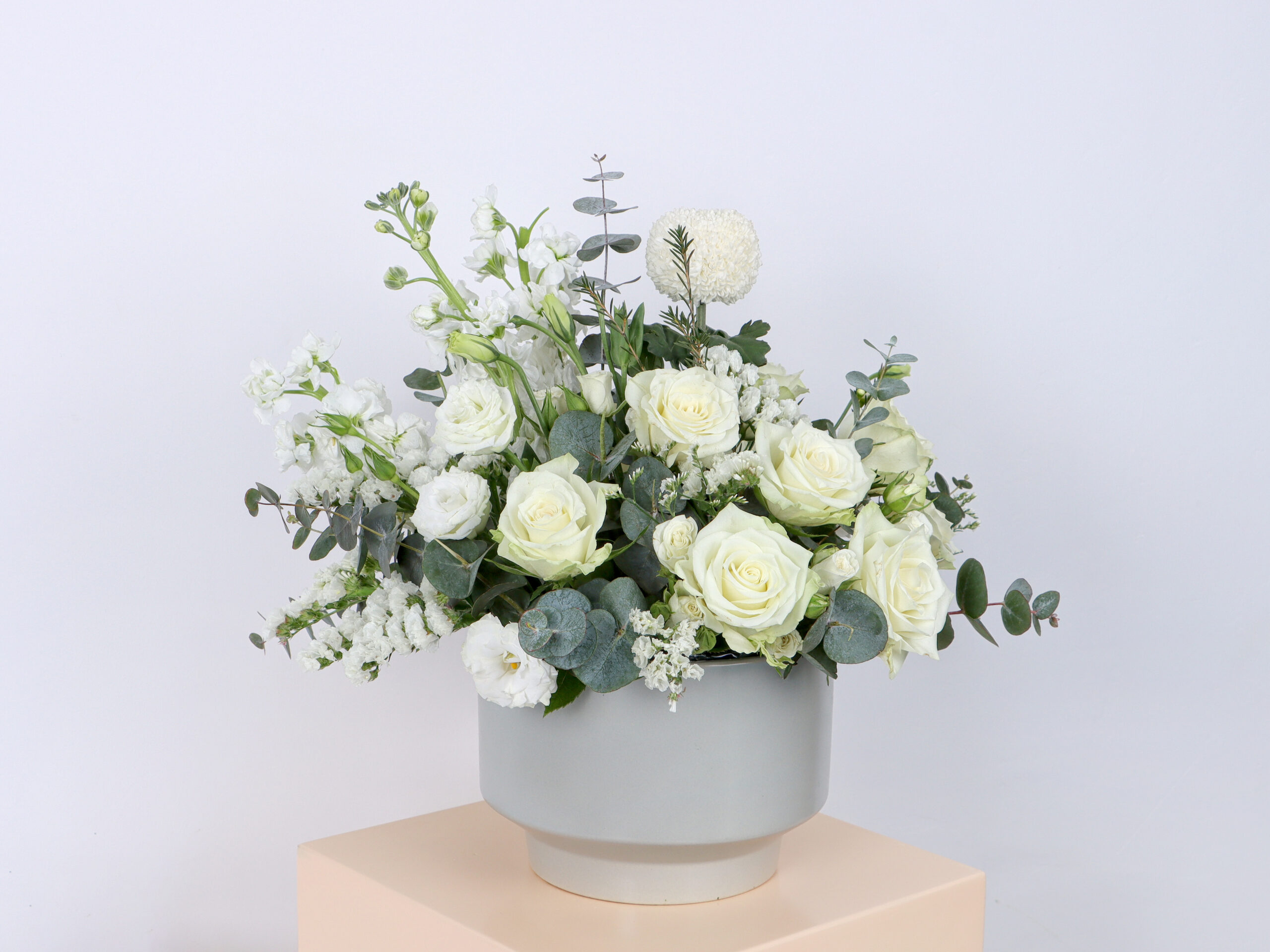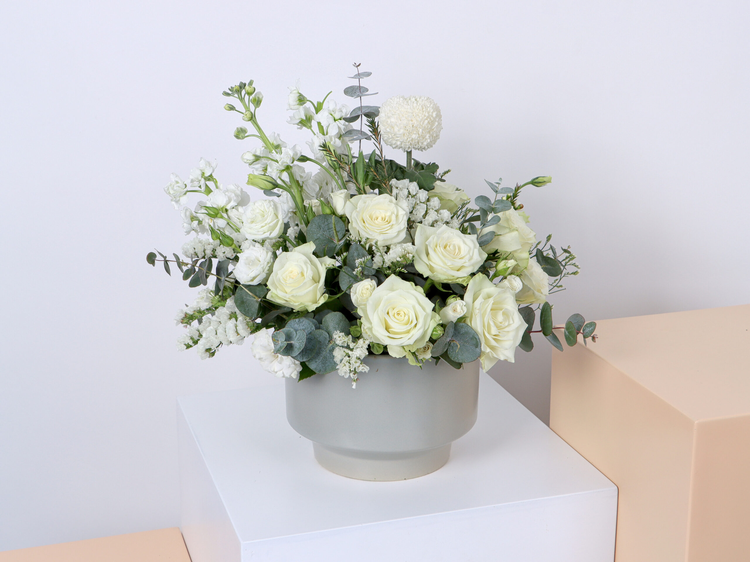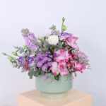 Light green ceramic with roses, baby roses, soft Astoma, distinctive Matthiola, chrysanthemum, statice, and fragrant eucalyptus in a wonderful and beautiful arrangement ( Large size)