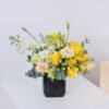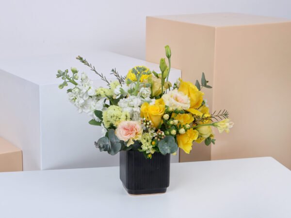 Black ceramic with yellow roses, soft Astoma flower, distinctive Matthiola, daisy, hypericum and fragrant eucalyptus in a wonderful and beautiful arrangement (small size)