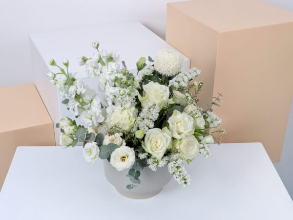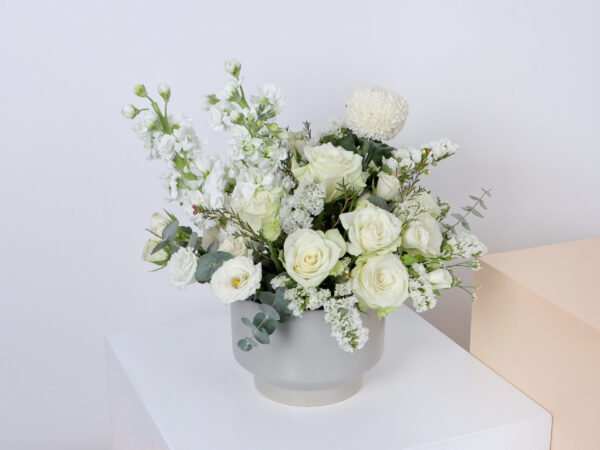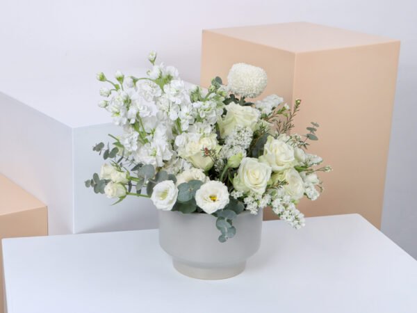Grey ceramic with roses, baby roses, soft Astoma, distinctive Matthiola, chrysanthemum, statice and fragrant eucalyptus in a wonderful and beautiful arrangement (Medium size)