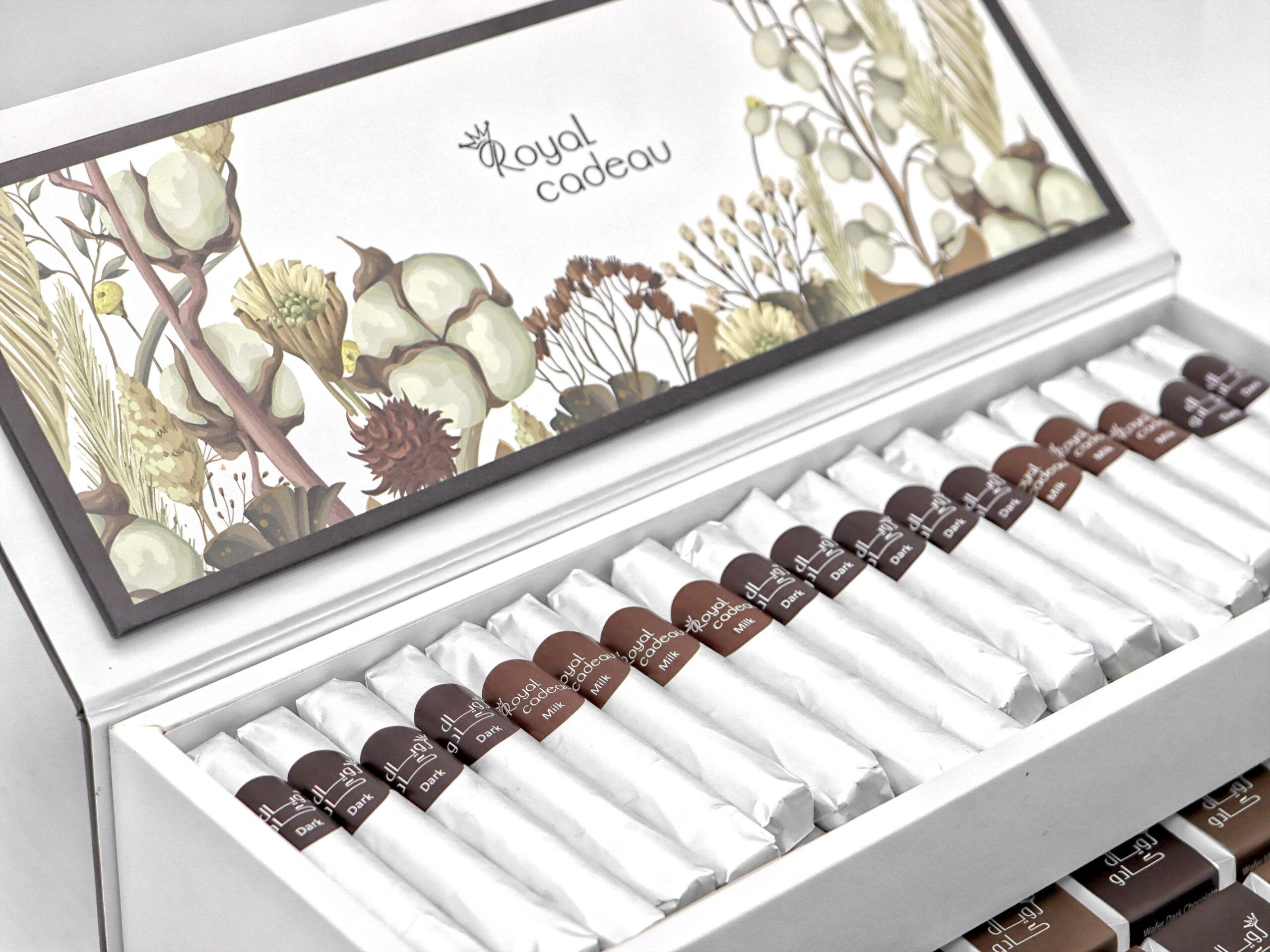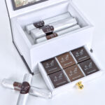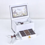 Chocolate drawer box (dark and milk) in the form of pieces and rolls inside a distinctive and beautiful box