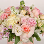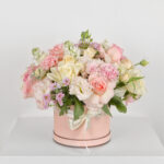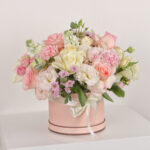 Eternal Love box from Roses and Baby Roses in white and peach with the Matthiola flower and the carnation flower giving the box bright and wonderful colors in a beautiful arrangement that indicates love and care, with the addition of the Santini chrysanthemum flower so that you have a beautiful and soft box as a gift for someone dear to your heart.