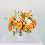 Fish ball 3 roses and baby roses in white and orange with a beautiful and distinctive Matthiola flower and an Alstroemeria flower with a soft Santini flower in a beautiful and wonderful arrangement