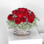 basket flowers 10 : with roses in a beautiful, romantic red color, with luminium between the roses, in addition to gypsophila on the sides of the basket for a beautiful and wonderful coordination and appearance.