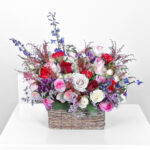 flower basket 12 : with roses and baby roses in pink, white and red, with a special Dolphinium flower, a soft carnation flower and an Alstroemeria flower, in addition to luminum for a beautiful and wonderful arrangement and appearance.