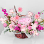 Flower basket of 17 with light and dark pink roses and baby roses, with the distinctive Gerbera flower and the soft Matthiola flower, in addition to limanium and Eucalyptus with a fragrant scent, in a beautiful and wonderful arrangement. Note: You can put a gift or a message in the middle of the basket.