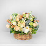 Flower basket 19 with roses and baby roses in peach and light orange with a beautiful soft carnation flower with a distinctive Matthiola flower in addition to rascus and Eucalyptus with a fragrant scent in a beautiful and wonderful arrangement.