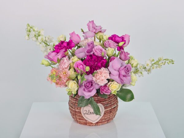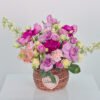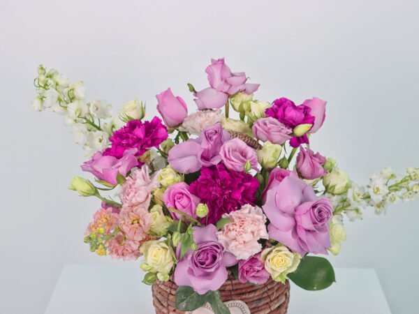 Flower basket 3 with roses and baby roses in light, dark pink, purple and white with the distinctive Matthiola flower