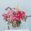 A flower basket 6 with roses in light pink and fuchsia, with the distinctive lily flower in pink, with a little carnation flower, Diego and Matthiola, in addition to liminum and burlap placed around the basket in a beautiful and wonderful arrangement.