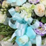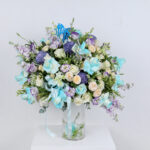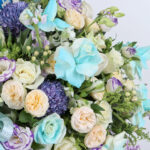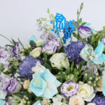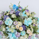 flower vase: roses and baby roses in blue and white with the distinctive Matthiola flower and the soft Astoma flower, in addition to the special chrysanthemum flower, solidago and hypericum flower with a ribbon in the shape of a butterfly and a baby boy stick in a beautiful and wonderful arrangement.