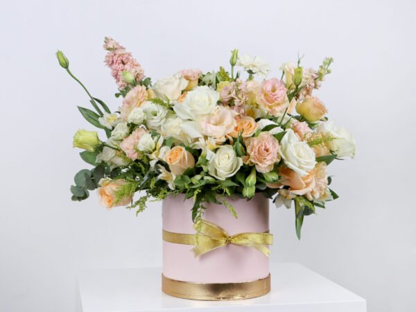 A golden autumn box of roses and baby roses in peach and white with a fragrant scent, with a Matthiola flower, a ostomy flower, and a distinctive gerbera flower with Solidago and Eucalyptus with a fragrant scent, so that you have a beautiful and wonderfully arranged box in beautiful autumn colors as a gift for someone dear to your heart.