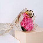 Bouquet of 20 pink roses with a happy birthday stick and a beige wrapper