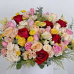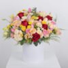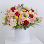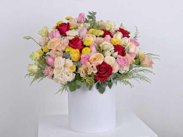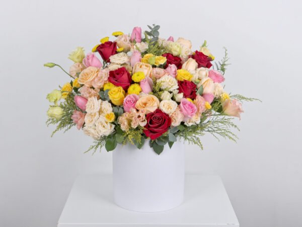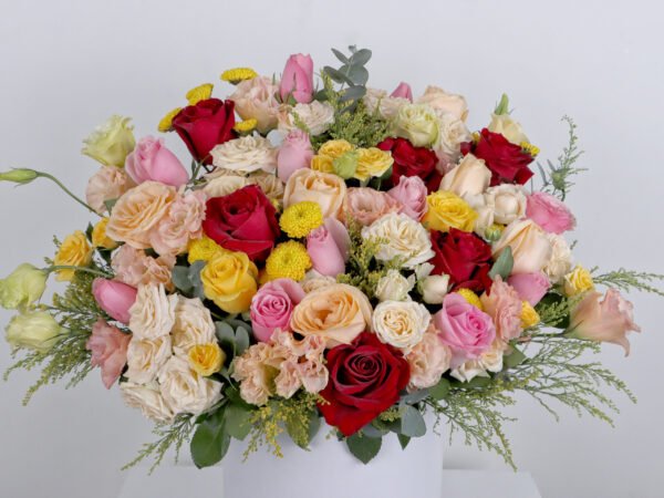 A huge joy box of roses and baby roses in red, pink, peach and yellow with the distinctive chrysanthemum flower and the astoma flower with the fragrant Eucalyptus and Solidago so that you have a huge box full of beautiful colors in a wonderful arrangement as a gift for someone dear to your heart.
