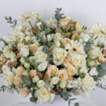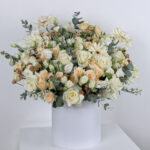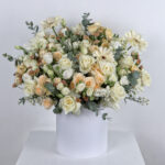 A huge luxury autumn box of roses and baby roses in vibrant white and peach with the distinctive Gerbera flower, in addition to the beautiful natural looking Santini and Daisy flower with the fragrant Eucalyptus scent, beautifully arranged within a huge white box filled with wonderful flowers in beautiful autumn colors as a gift for someone you love and who is dear to you. Your heart