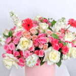 The huge pink luxury box of Roses and Baby Roses in white, dark and light pink with the distinctive Gerbera flower and the Matthiola flower in a beautiful and luxurious arrangement so that you have a box full of beautiful and large flowers as a gift for someone you love and who is dear to your heart.