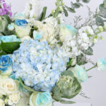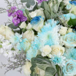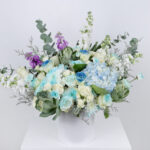 The huge white luxury box of Roses and Baby Roses in white and light blue with the distinctive, lively Hydrangea flower, with the Matthiola flower in white and purple, with the chrysanthemum flower in white and light blue, with Liminium and the fragrant Eucalyptus, beautifully arranged within a huge white box to be a special and luxurious gift for someone you love. And dear to your heart