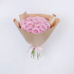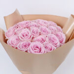 20 soft romantic roses with a beige paper cover and a soft pink ribbon that adds beauty to the bouquet. A beautiful gift with a wonderful arrangement for someone dear to your heart.