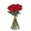 A bouquet of 25 bright red roses wrapped with a rope, without a wrapper, in a beautiful and wonderful arrangement.