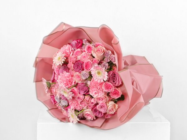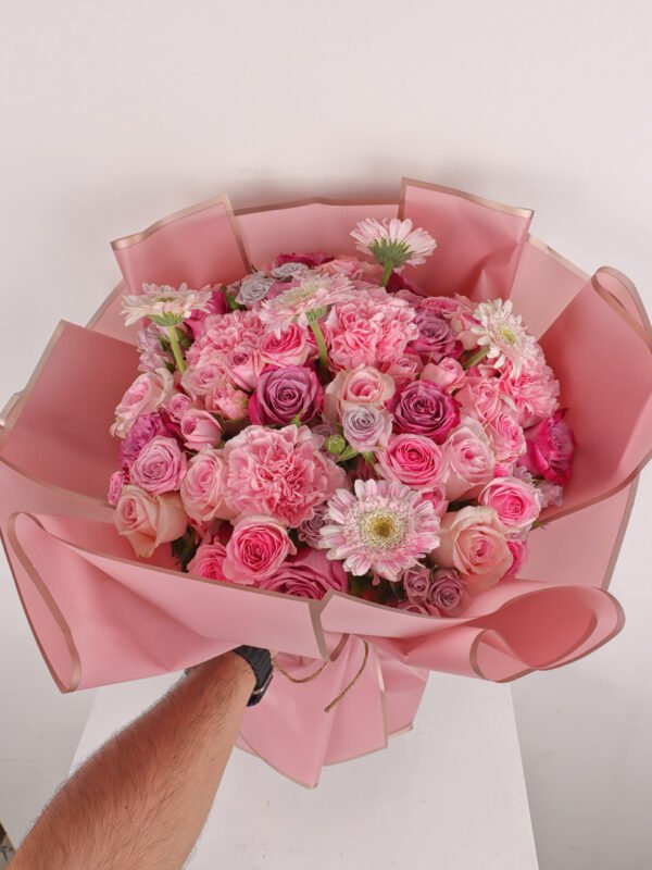 Mixed bouquet 16 : roses and baby roses in light and dark pink and deep purple with a soft carnation flower and a distinctive gerbera flower with a dark pink wrapper and a rope to tie in a beautiful and wonderful arrangement.