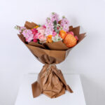 Mixed bouquet 3 : roses and baby roses in light and dark pink, purple and orange with a soft Matthiola flower and a vibrant sunflower with a Santini flower in various colors with a brown wrapper and a rope to tie in a beautiful and wonderful arrangement.