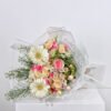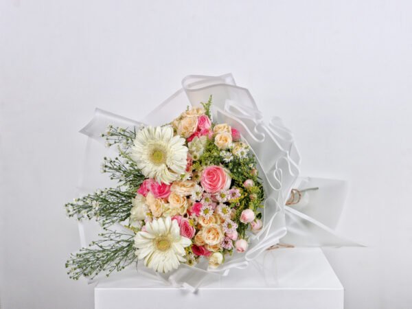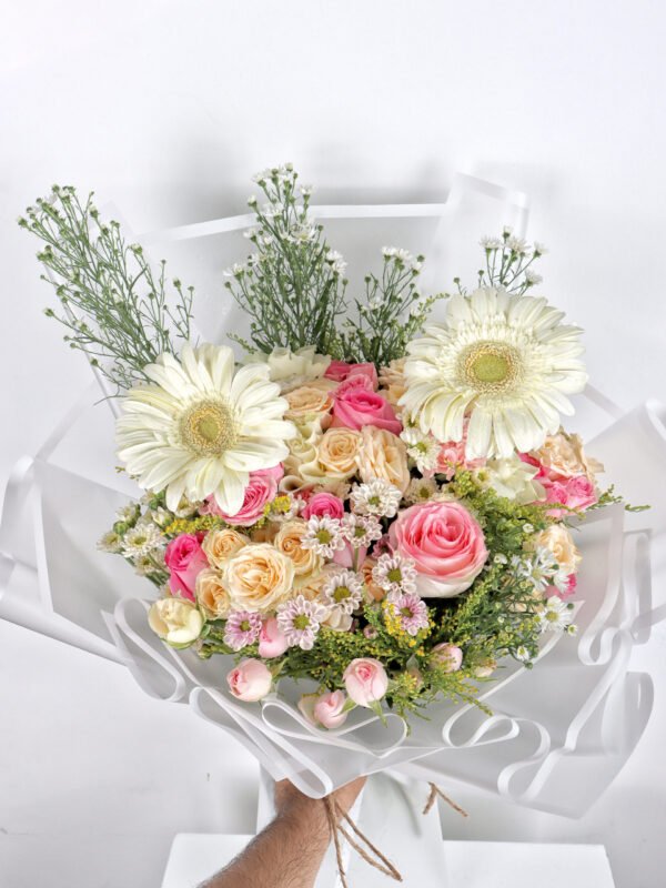 Mixed bouquet 30 : roses and baby roses in pink, peach and white, with a distinctive, vibrant Gerbera flower and a Santini flower, in addition to a solidago with a white cover and a rope to tie, in a beautiful, distinctive and wonderful arrangement.