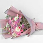 Mixed bouquet 44 : roses and baby roses in light and dark pink with the distinctive, vibrant Gerbera flower, a soft Astoma flower, and a purple chrysanthemum flower, in addition to a solidago with a pink wrapper and a rope to tie, in a beautiful, distinctive, and very wonderful arrangement.