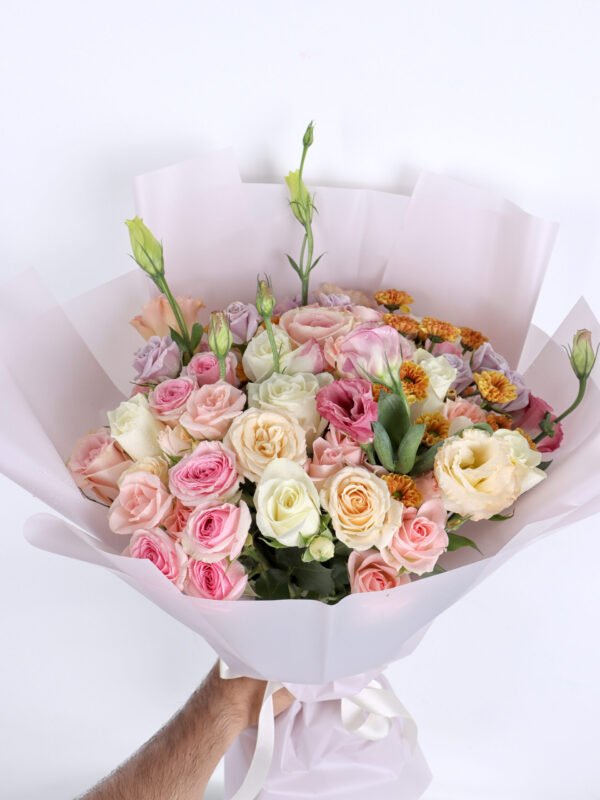 Mixed bouquet 7 : roses and baby roses in light and dark pink, peach, white and deep purple with the distinctive Astoma flower and the special vibrant Santini flower with a light pink wrapper and white ribbon in a beautiful and wonderful arrangement.
