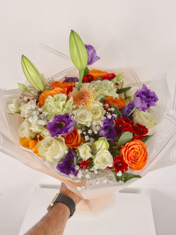 Mixed bouquet 8 : roses and baby roses in white and orange with a vibrant Astoma flower and an Alstroemeria flower with a distinctive Gerbera flower and a little Lily flower with gypsophila in a light brown wrapper with a rope to tie in a beautiful and wonderful arrangement.