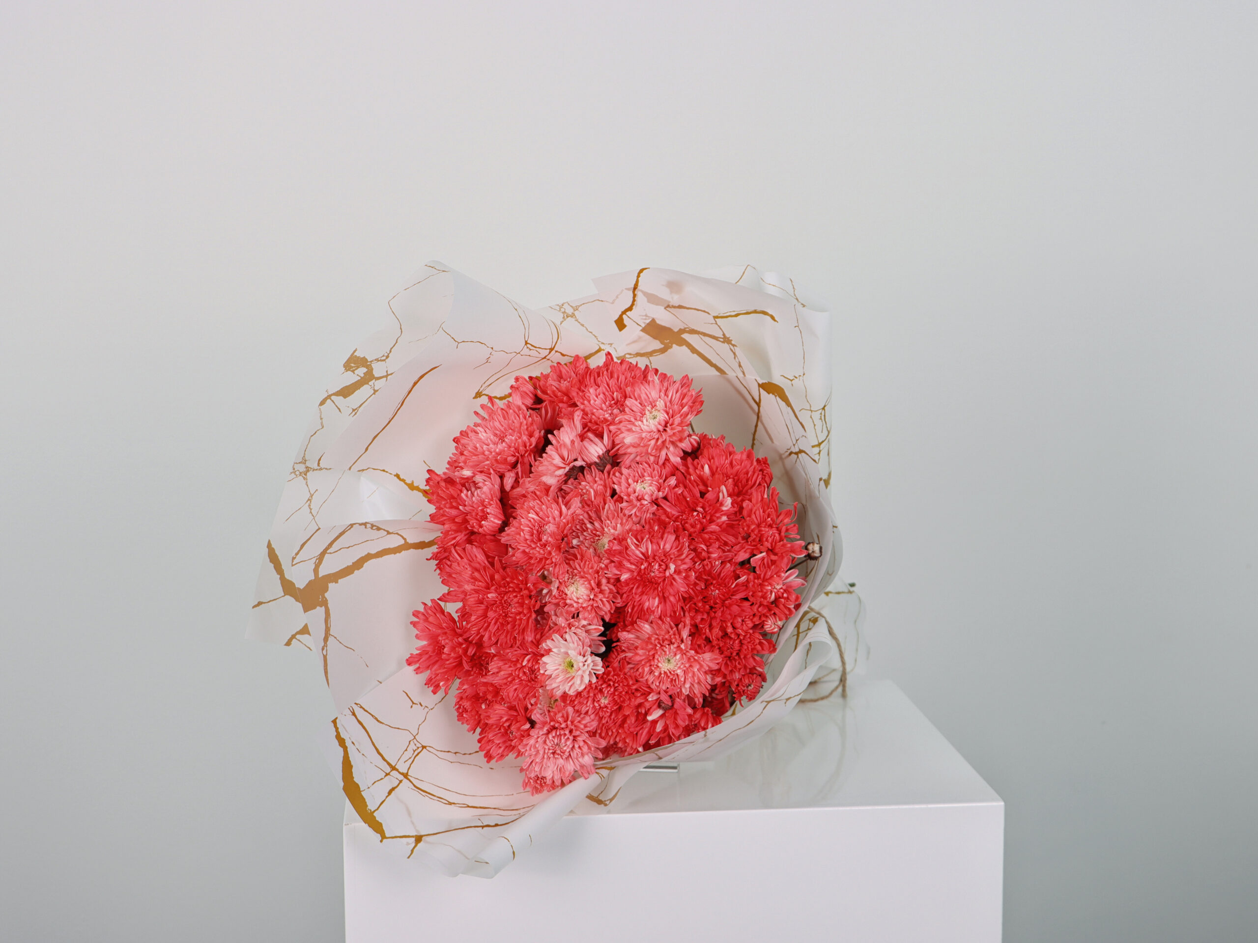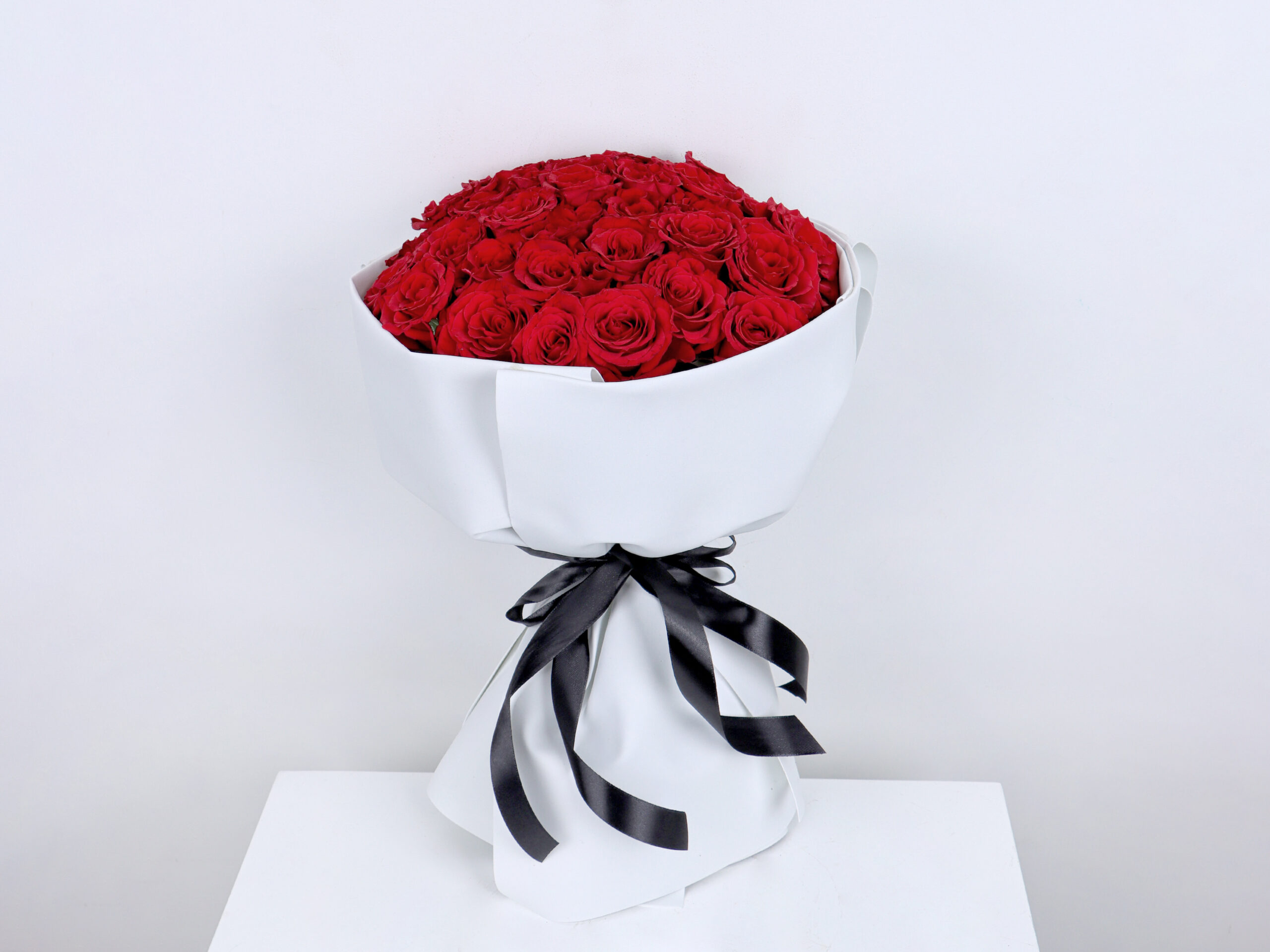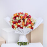 A bouquet of 50 roses in orange, white, fuchsia, red and pink, arranged gradually one after the other, with a soft white cover in a beautiful and wonderful arrangement, as a beautiful gift for someone dear to your heart.