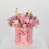An elegant pink box with roses and baby roses in romantic pink with the distinctive Matthiola flower and soft carnation with statice, limnium and fragrant eucalyptus with a rose letter on the outside of the box of your choice as a beautiful gift for someone dear to your heart