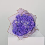 Beautifully arranged purple chrysanthemum bouquet with light pink wrapper and silver ribbon