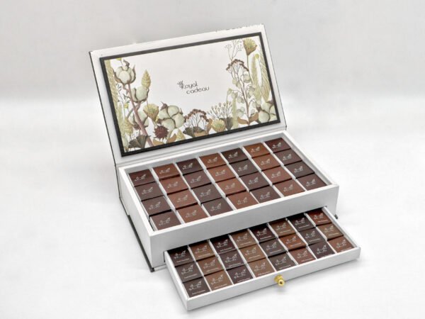Royal Cadeau Drawer with dark and milk chocolate flavor inside a box consisting of a drawer and pieces of chocolate
