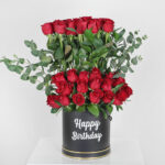 A special birthday box with red roses in a very special arrangement next to each other with fragrant Eucalyptus in a black box with Happy Birthday written as a gift for someone dear to your heart.