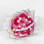 A special Happy Birthday bouquet of roses in white, fuchsia and light pink, beautifully arranged next to each other, full of life and love, with a Happy Birthday ribbon in the middle.