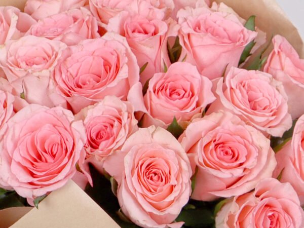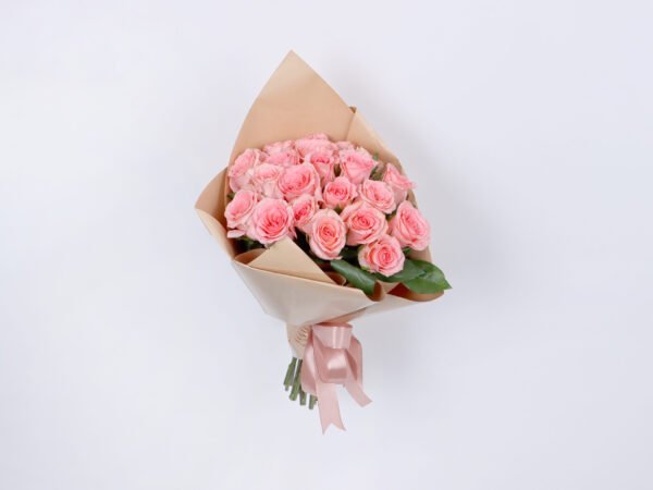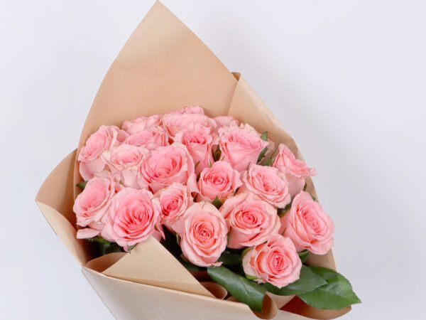 20 soft romantic roses with a beige paper cover and a soft light brown ribbon that adds beauty to the bouquet. A beautiful gift with a wonderful arrangement for someone dear to your heart.