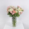 Flower vase 11: roses and baby roses in light, dark pink and white with the distinctive Gerbera flower, Santini flower and the soft and vibrant carnation flower, in addition to rascus inside a cylinder filled with water in a beautiful and wonderful arrangement.