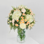 Flower vase 21 : from Baby Roses in peach color with a soft carnation flower with a special Hydrangea flower in addition to rascus and solidago in a beautiful and wonderful arrangement