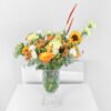 Flower vase 40 : from roses and baby roses in yellow, orange and white with the distinctive Alstroemeria flower, the beautiful soft carnation flower, and the special bright sunflower flower, in addition to Eucalyptus hypericum with its fragrant scent, in a beautiful and wonderful arrangement inside a vase filled with water.