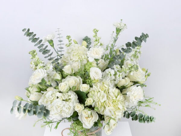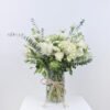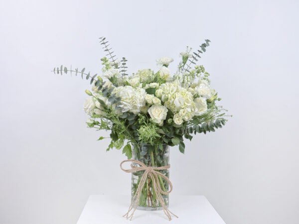 Cyander contains roses, baby roses, hydrangea, astoma, matthiola, and carnation with eucalyptus and solidago in a beautiful arrangement inside a cyander filled with water.